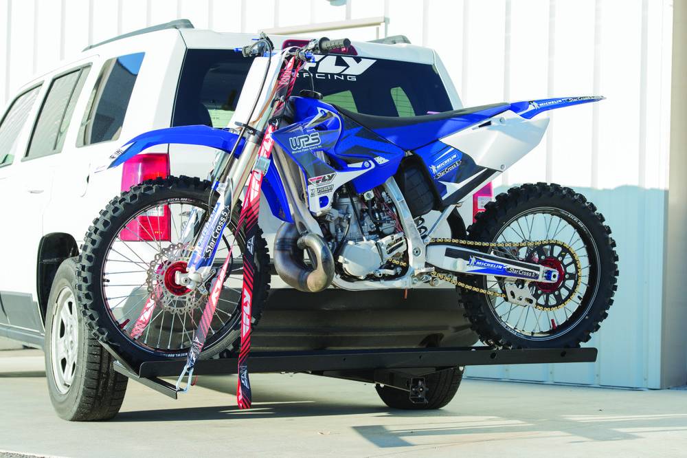 FLY RACING MOTORCYCLE CARRIER $279.95 61-5365 Brand Number: 111635 UPC: 191361161148 Weight: .75 lbs Package Dimensions: 73.00 x 7.00 x 4.00 Features: Textured, powder coated 72" channel constructed from 3/16" Steel Channel support bracket constructed from Heavy Duty 10GA steel Receiver tube & wedge constructed from 11GA structural steel tubing Threaded wedge lock hitch system virtually eliminates hitch wobble Zinc coated Grade 5 Bolts with Nylon lock nuts Reversible design allows you to load bike from the left or right Front wheel chock is adjustable to allow any size motorcycle to be centered on the carrier Punched holes in channel allow use of wheel ties to lock rear wheel down Loading ramp (included) has a locking tongue to attach to the carrier to ease in the loading and unloading, stores neatly between the wheels when not in use Rated at 400 lbs Works with any 2" class III hitch Made in the USA
