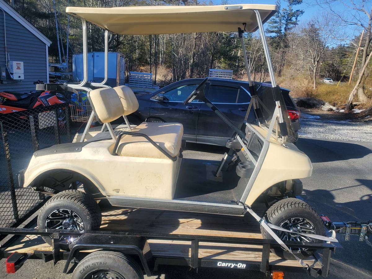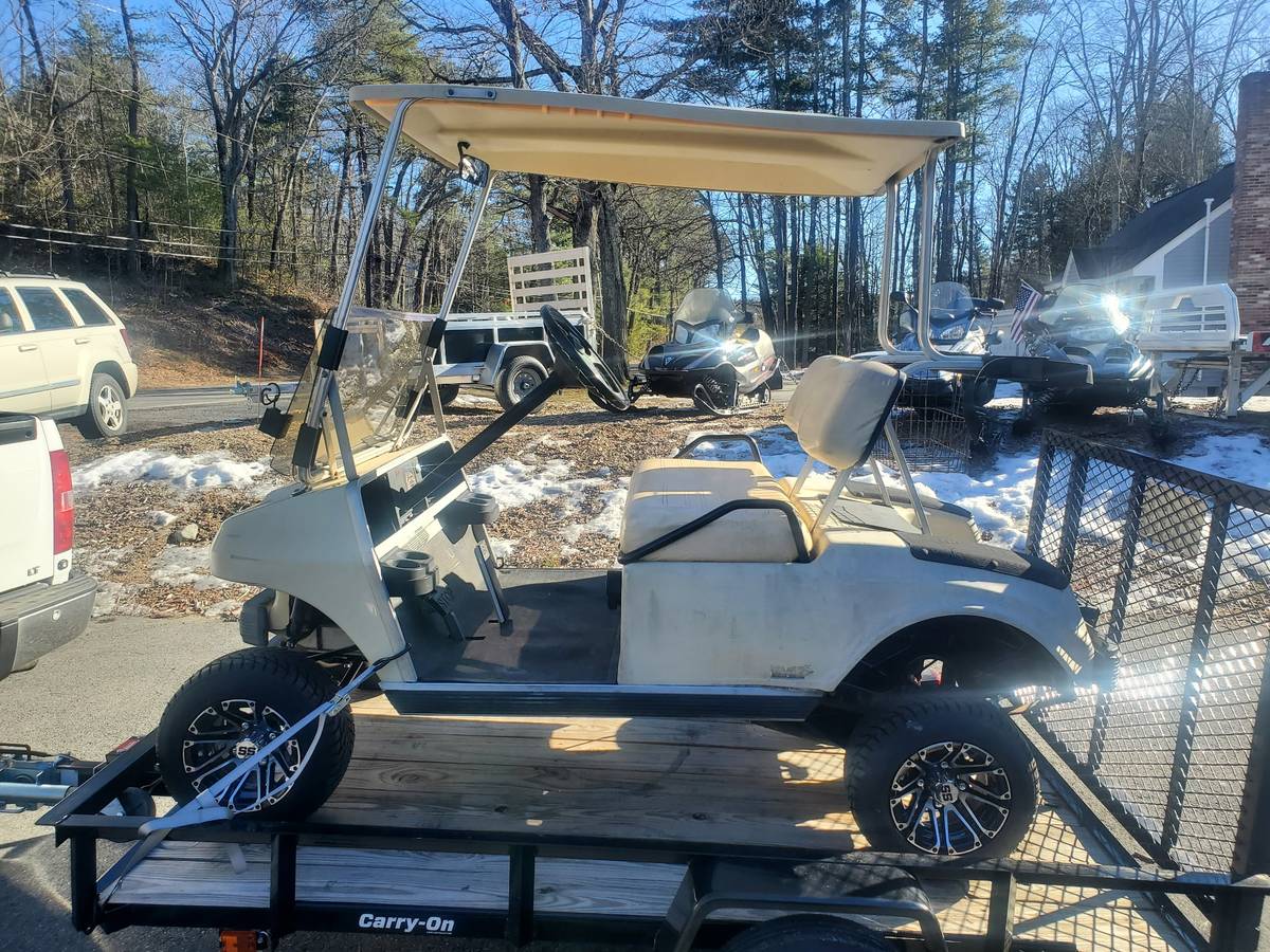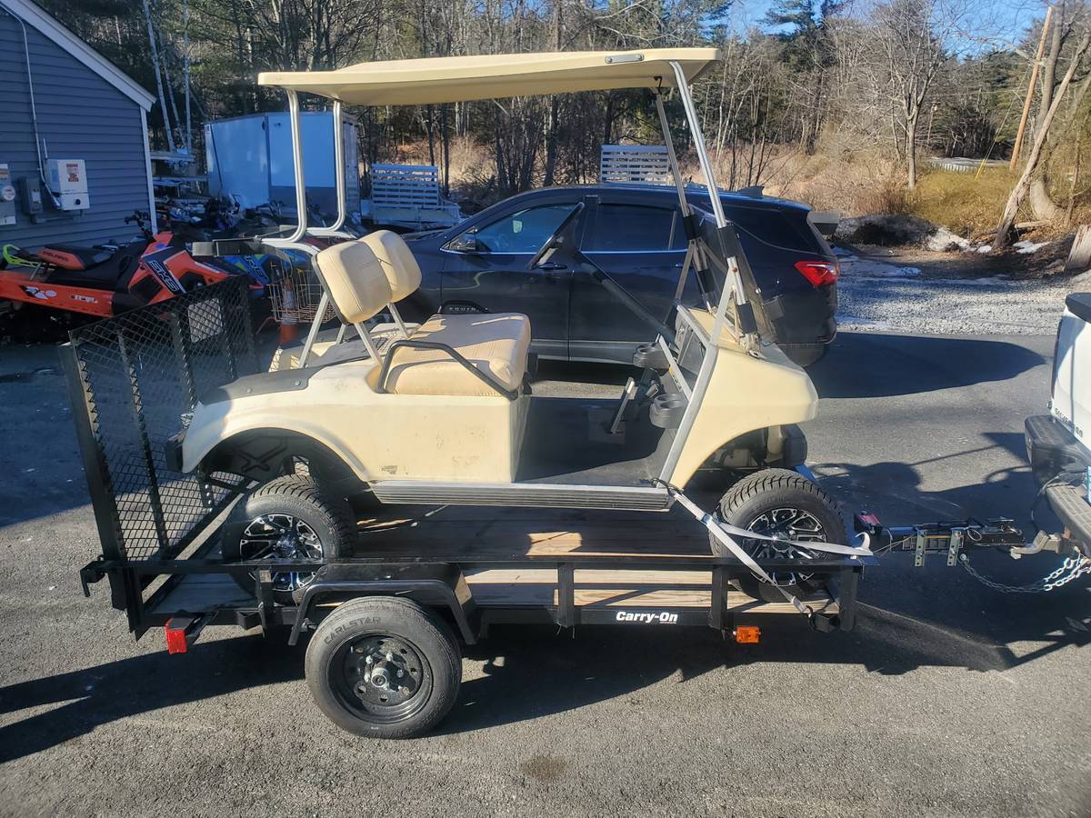 2025 Carry On black open 5’x8′ fold-down ramp single-axle trailer. This trailer is pre-owned. Does not come with golf cart shown in photos.
